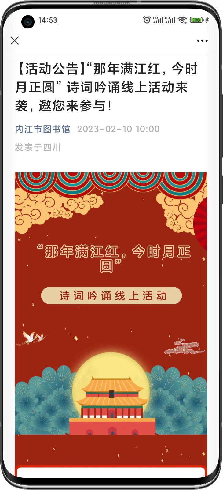 近日,我馆携手川渝地区公共图书馆联合开展的线上诗词吟诵活动“那年满江红,今时月正圆”圆满结束!本次活动自2月8日启动持续至2月28日,历时20天,赢得了读者朋友们的热情参与,截止2月28日24点,活动累积访问量105643人次,成功报名人数571人,有效朗诵作品数419个,总投票数49140票,其中个人作品最高点赞数3115票!