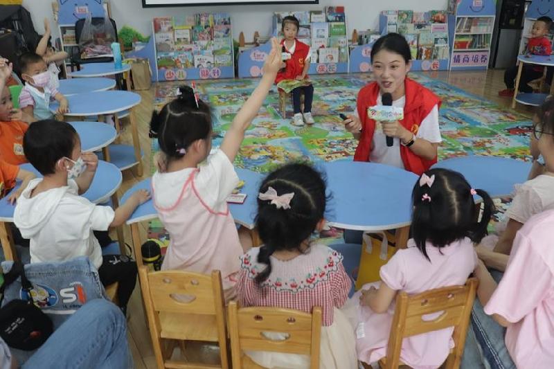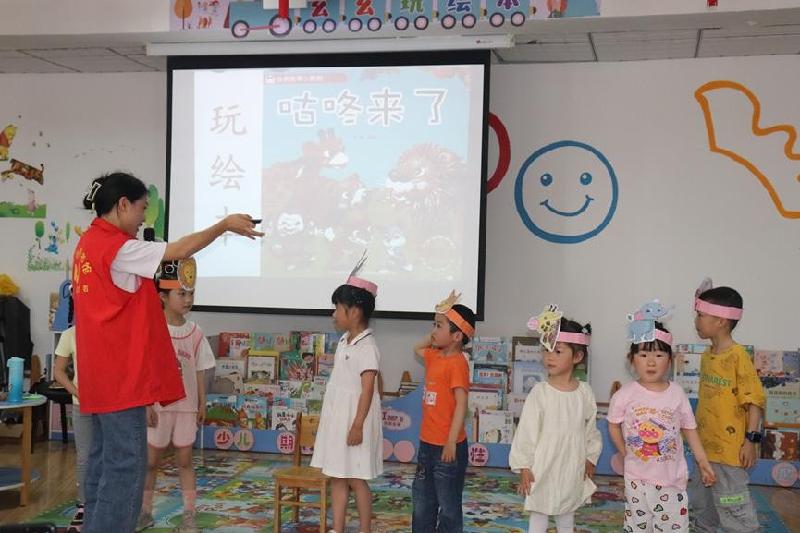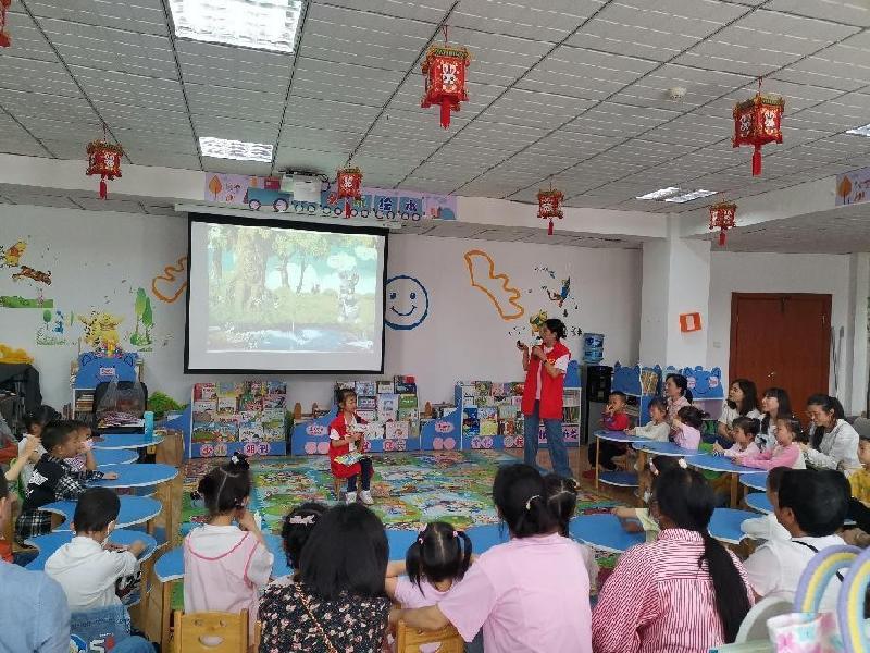 活动由来自内江六中的徐飞老师和女儿李悦可为现场孩子们带来一本好玩的绘本书——《咕咚来了》。绘本讲述了兔子因为听到了“咕咚”的声音,以为怪物来了而逃跑,引得其他小动物也因此而逃,之后狮子带领大家了解真相——原来是木瓜掉进湖里的声音。
