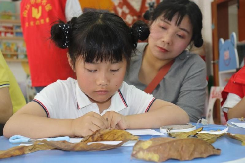 接下来“玩绘本”,活泼机灵的孩子们大胆的把故事角色扮演得活灵活现,迎来家长们连连的夸赞和热烈的掌声,大家共享着阅读带来的快乐,故事的温馨和现场亲情交融在一起,整个活动场面是那么轻松、欢乐。最后老师带领孩子们一起做创意手工“粘贴树叶”,一片片五彩斑斓、千姿百态的落叶“活”了起来,心灵手巧的孩子们创作出了一幅幅精美别致的树叶画,空气中弥漫着浪漫的清香与书香,孩子们收获满满,共读活动在欢声笑语中结束。