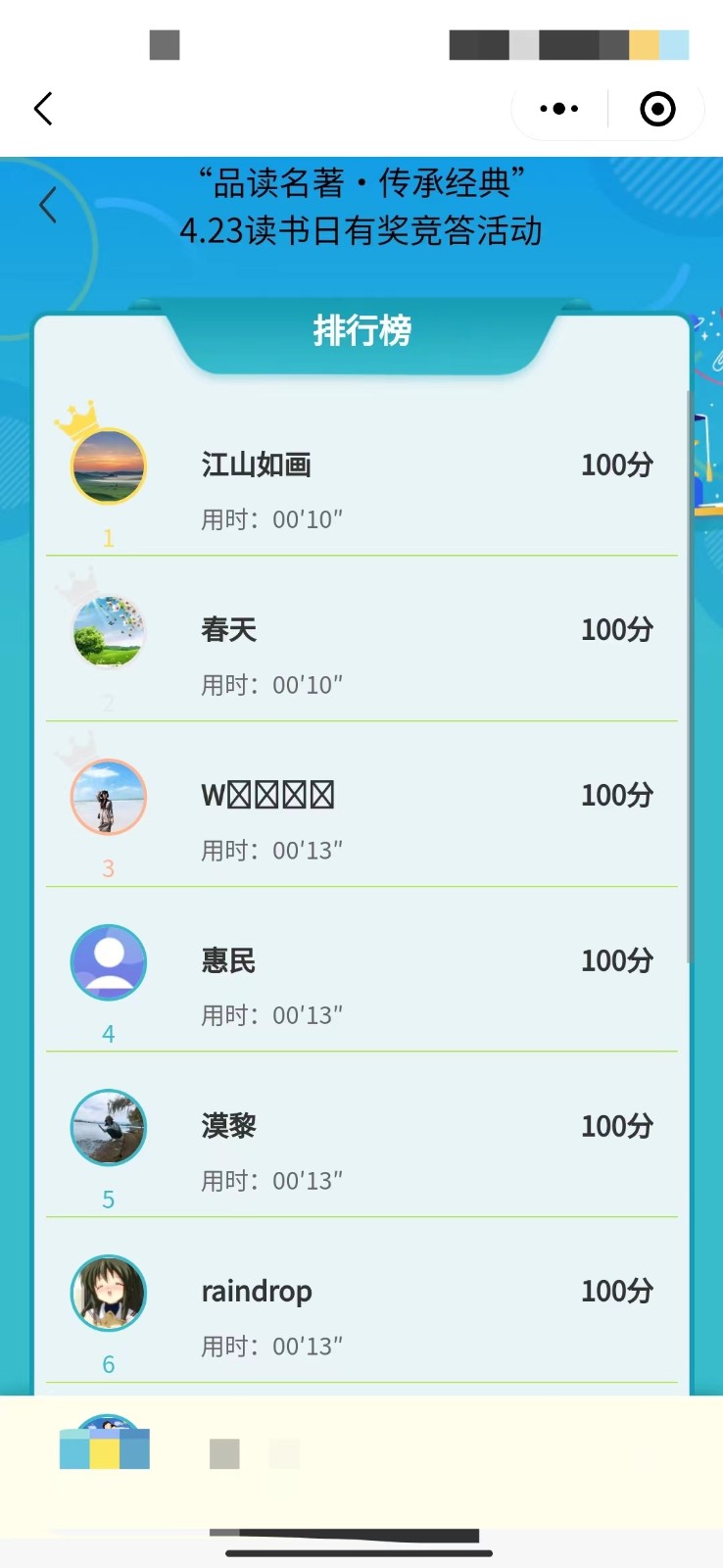 线上答题活动自4月20日启动,持续至5月3日,历时2周,吸引了广大读者踊跃参与。截止活动结束,共1869人报名该活动,1808人参与答题,806个满分读者,答题速度最快的仅10秒,活动答题量高达238001次。活动以《西游记》《红楼梦》《水浒传》和《三国演义》这四大名著中的文学常识为题库,读者仅需通过扫描小程序二维码即可参与,最终以答题分数高、耗时短、答题日期早为序排名。最终评选出一等奖1名,二等奖20名,三等奖30名,幸运奖80名。