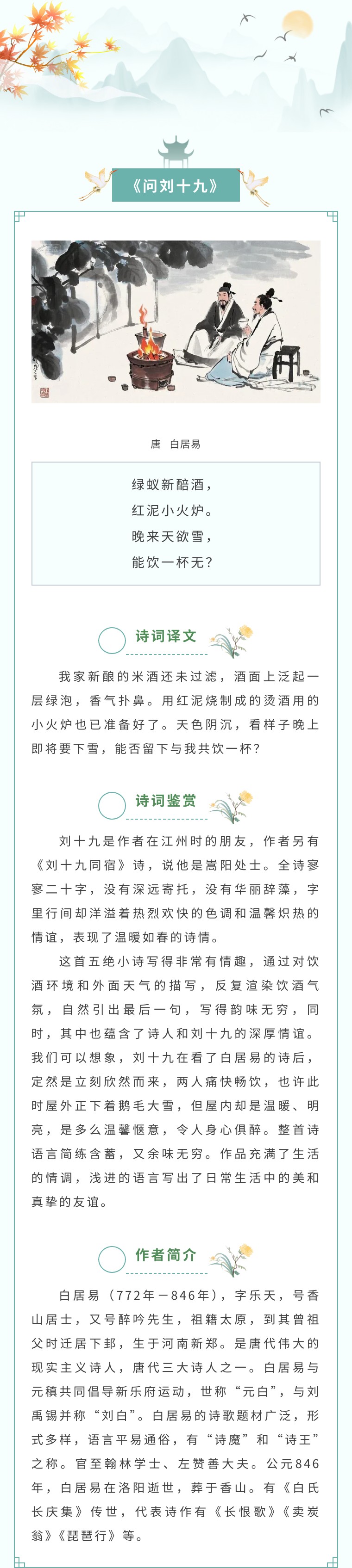 在唐诗的凛冽国度里,冬日的意象自成一家气象。“冻笔新诗懒写,寒炉美酒时温”,这闲适的吟咏宛若一扇结霜的轩窗,透出古人围炉话冬的万千情致。诗人与冬季的相遇,从来不只是与严寒的对峙。他们将生命的沉淀、岁月的感怀、人间的暖意,都凝于这片素白。《问刘十九》中,白居易以新酒炉火绘出友情的温度;《江雪》里,柳宗元用孤舟寒江勾勒出精神的傲骨。那些凝练的诗句,是他们对自然的礼赞,对孤独的品味,对温暖最深的眷恋。在这些诗行间,我们仿佛能触摸到千年前的冬日脉搏,破译那蕴含着生命韧性与人间烟火的冬之密码。