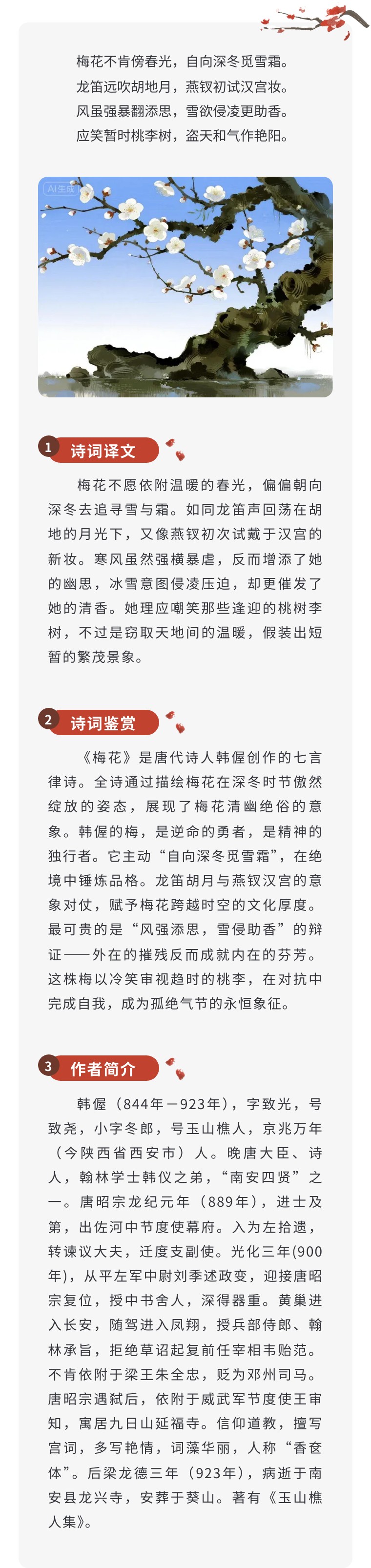 在唐诗的锦笺上,梅的意象总在胭脂色与冰雪魂之间摇曳生姿。白居易笔下“梅樱共发”的喧闹,是生命挣脱料峭的欢愉宣言;韩偓诗中“孤香微月”的幽独,是风骨穿透严寒的精神自白。这两株截然不同的梅树,宛若诗人留在时空中的双重印记——一株向着人间烟火热烈生长,一株朝着灵魂深处静默扎根。此刻,让我们循着这两脉梅香,在诗句间探寻美的不同的维度。