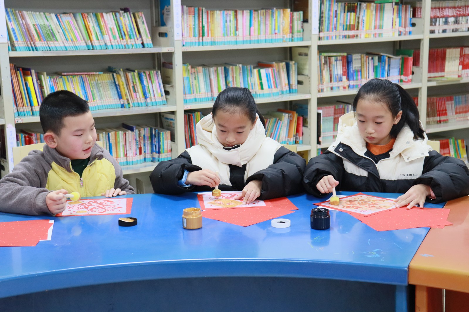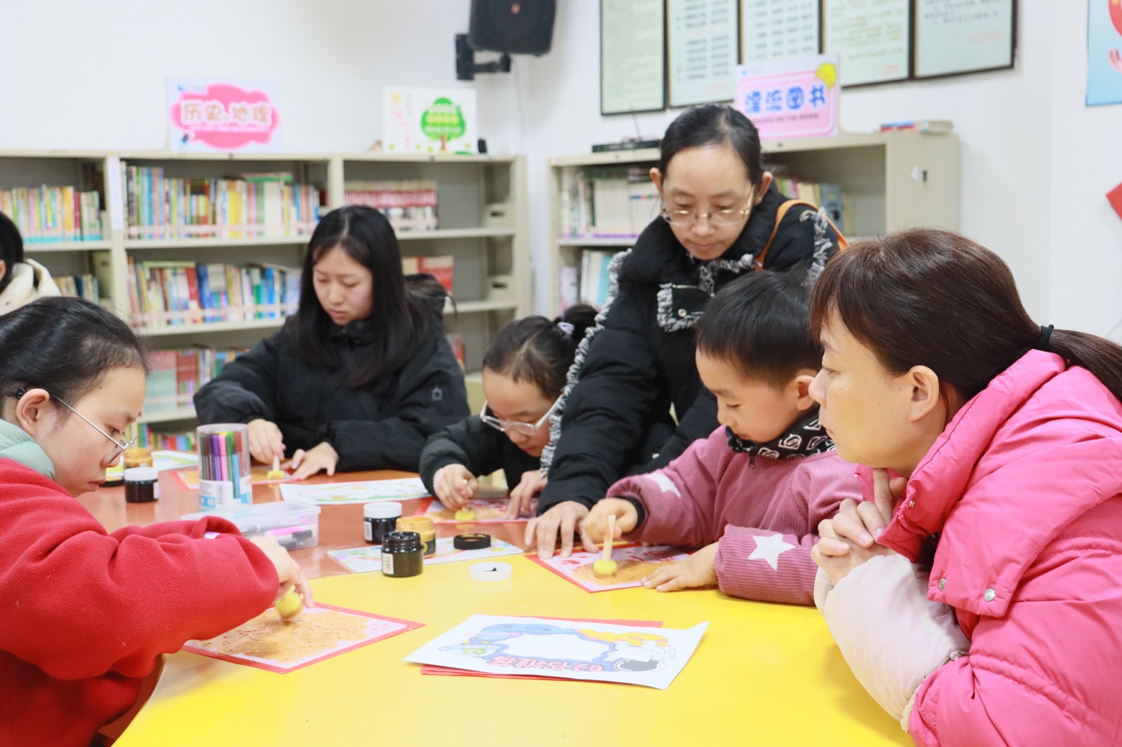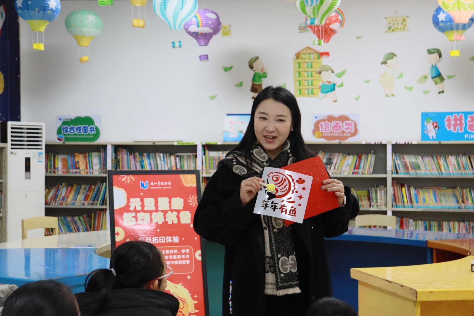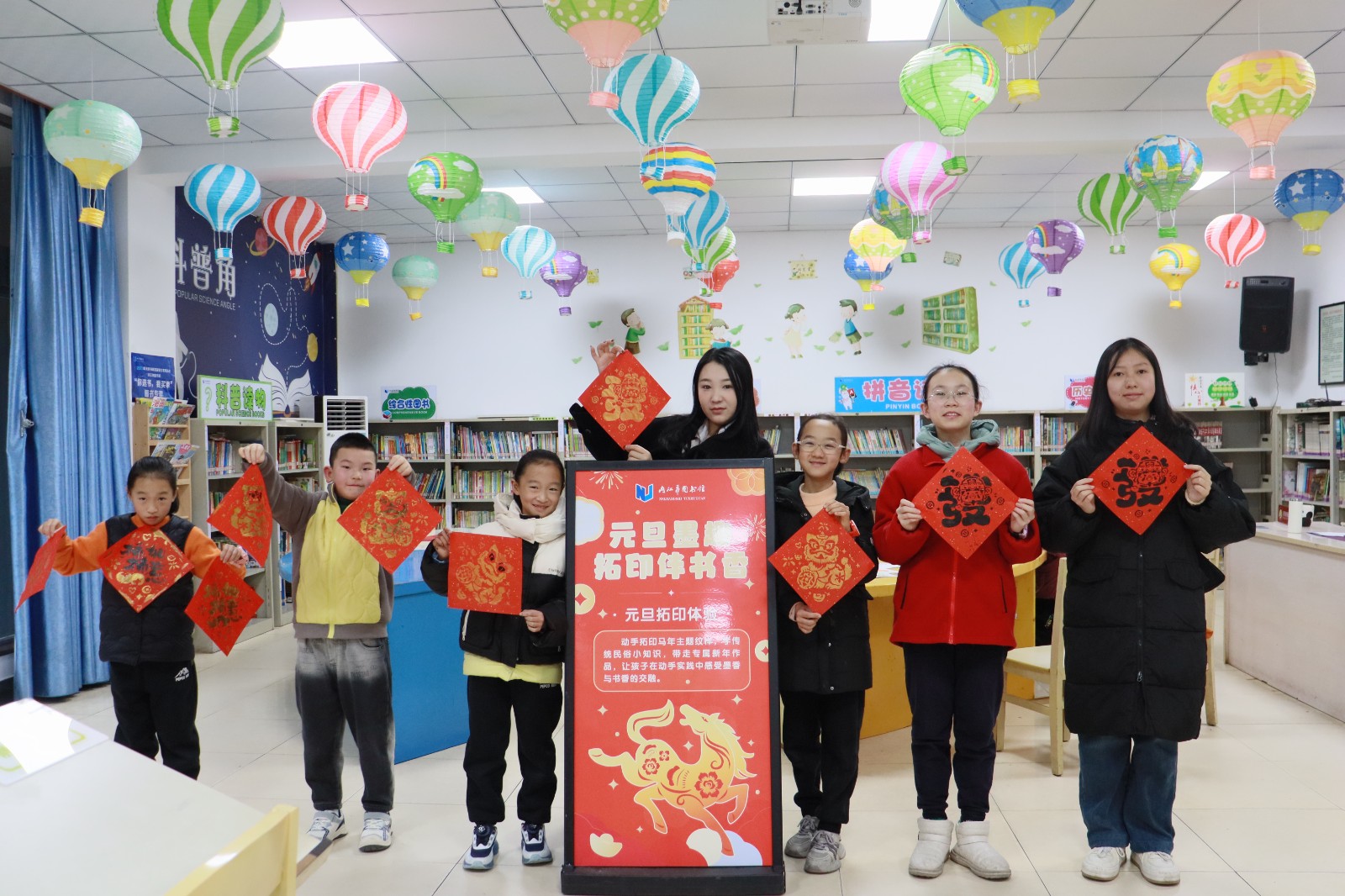 少儿阅览室里,“元旦墨趣,拓印伴书香”活动也同步热闹开启。活动一开始,工作人员就用趣味提问引出了话题,向小朋友们普及元旦的由来与传统习俗。“元旦为什么要贴福字”“马年有哪些吉祥寓意”,一个个有趣的问题抛出来,孩子们踊跃抢答,在欢声笑语中收获了不少传统文化知识。