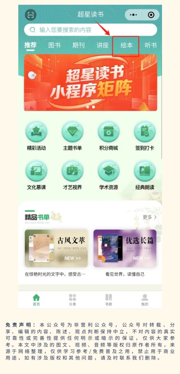 其次,点击小程序中“绘本模块”或根据绘本名称搜索绘本即可在线免费阅读。
