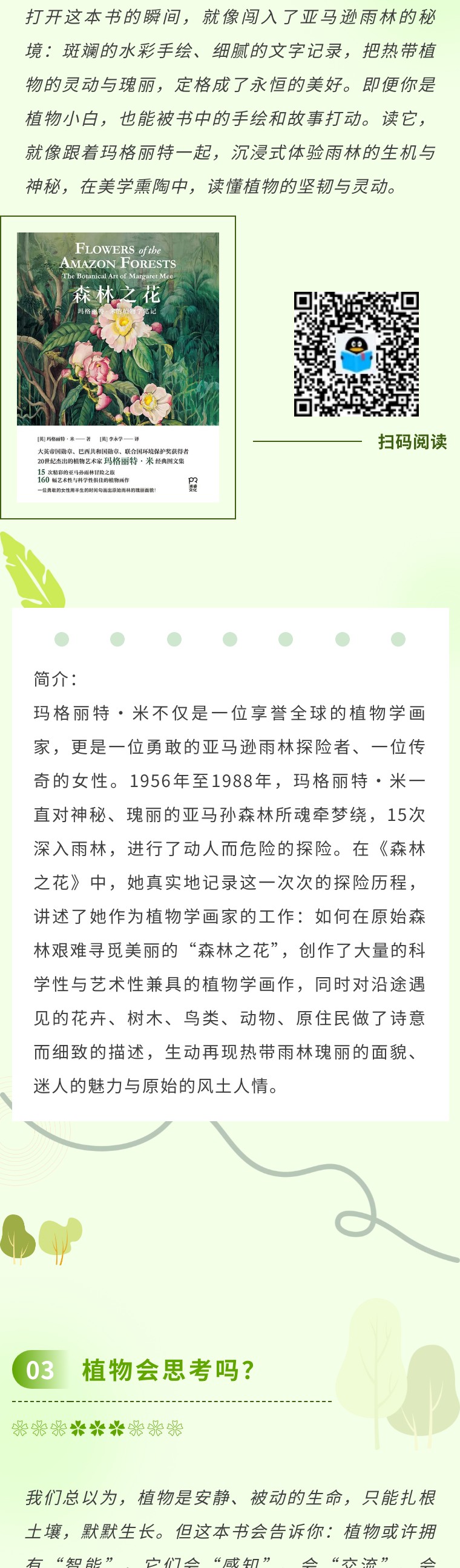 “树木仿佛在我们焦虑的额头上放下了一只安神的绿手……我们呼吸着这棵树,再无烦恼。”这是一本能“闻”到森林的书,打破了我们对植物的常规认知,它不聊枯燥的科属分类,不讲复杂的生长原理,而是以“气味”为入口,带我们走进13种树木的感官世界。