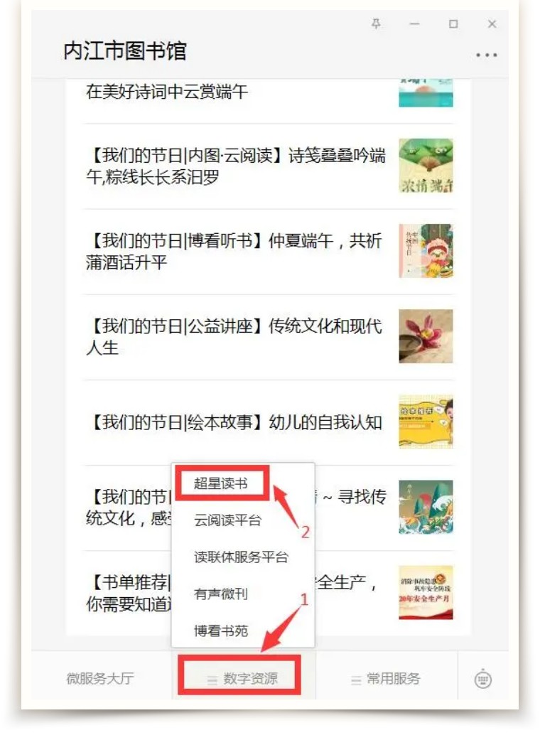 方法一:关注 “内江市图书馆公众号” ,点击进入“超星读书”小程序