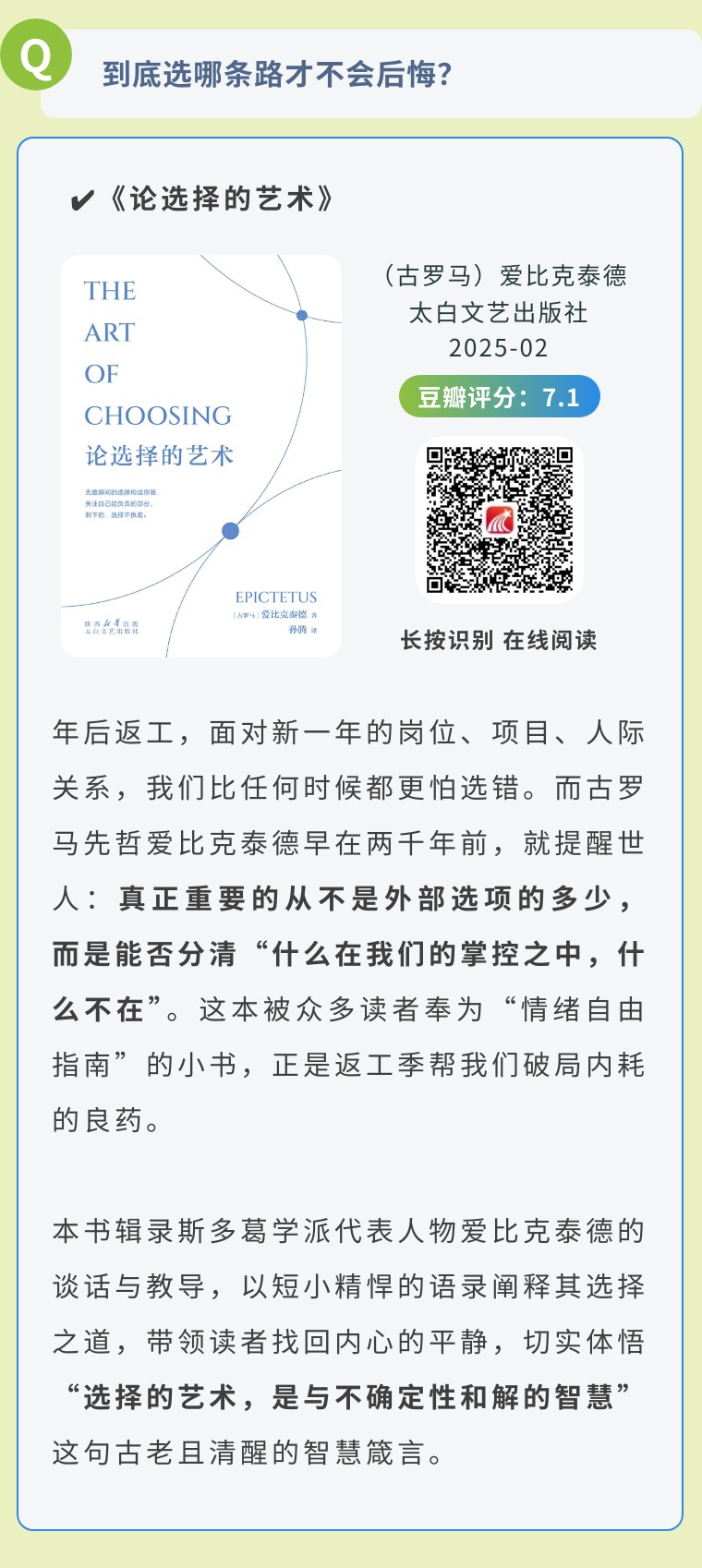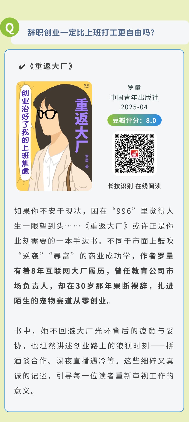 心态对人的影响至关重要,如何看待一件事,决定了我们做事时的心情,进而影响效率的高低与结果的好坏。如果你正在纠结于创业还是打工,踌躇于不同选择之间,甚至已经开始消极认命,以下这些书,或许能帮你重启内在节奏,找回前行的力量。