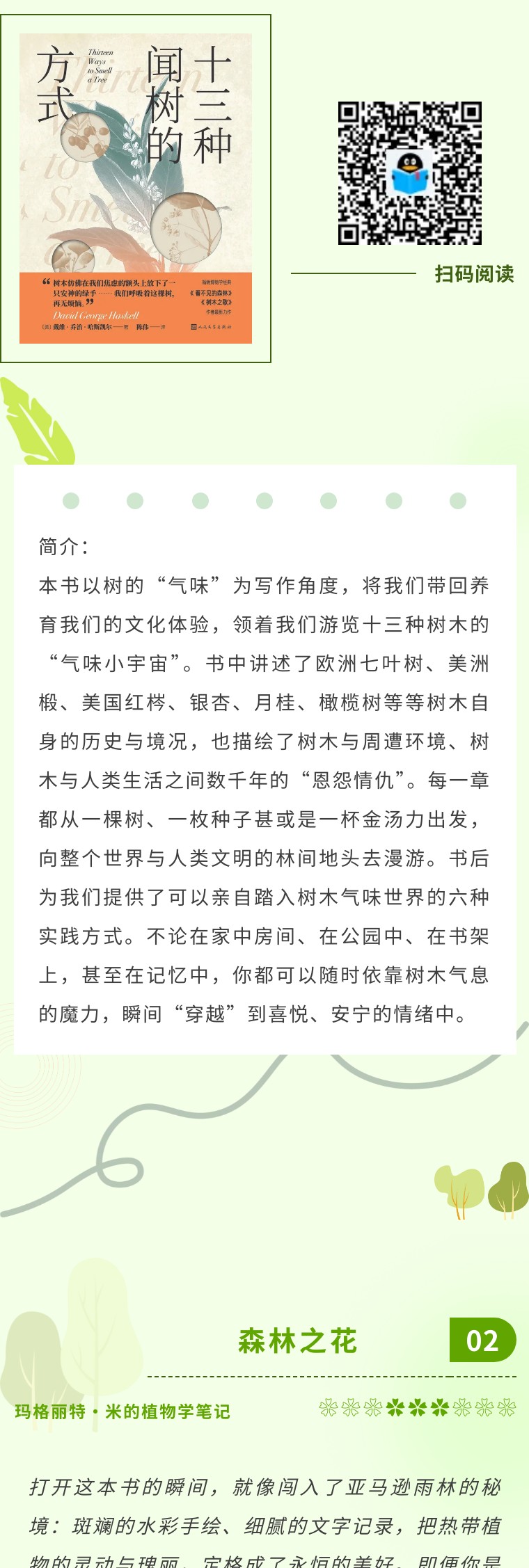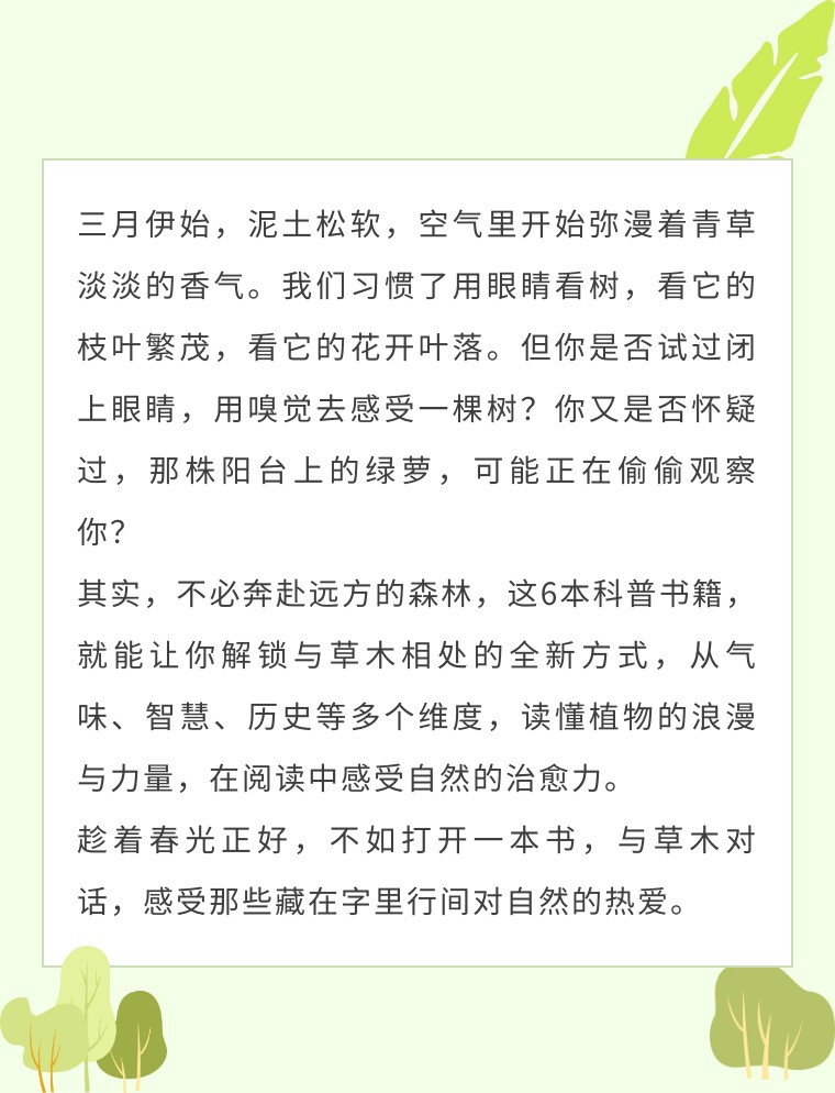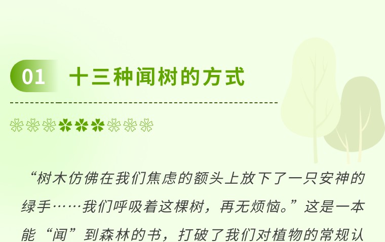 “树木仿佛在我们焦虑的额头上放下了一只安神的绿手……我们呼吸着这棵树,再无烦恼。”这是一本能“闻”到森林的书,打破了我们对植物的常规认知,它不聊枯燥的科属分类,不讲复杂的生长原理,而是以“气味”为入口,带我们走进13种树木的感官世界。