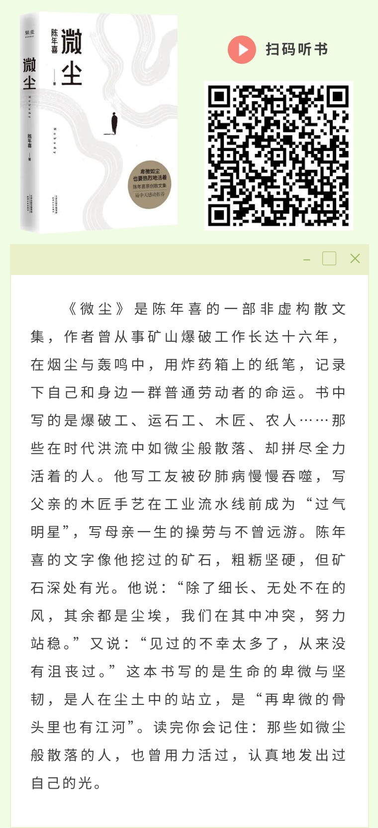 陈年喜的《微尘》,是爆破之后落定的尘埃。他写矿工,写父亲,写那些被生活碾过却依然站立的人。