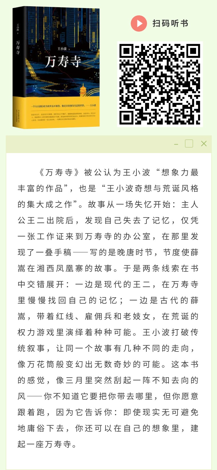 王小波的《万寿寺》是一座语言的迷宫,一座想象的长安城。他让故事在现实与虚构之间来回穿梭,让薛嵩和他的凤凰寨一次次重生。