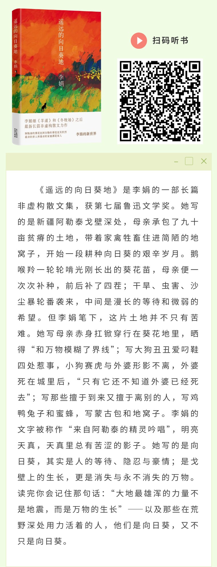 李娟的《遥远的向日葵地》明亮、辽阔,带着向日葵田里蒸腾起来的温热气息。她写母亲,写那片贫瘠又慷慨的土地,写人与大地之间那种笨拙又真挚的相依。